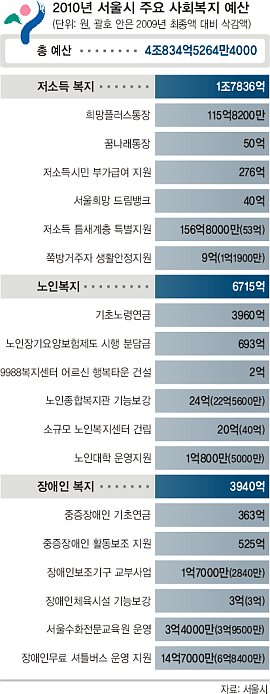 서울시 2010년 예산안이 시의회 의결을 거쳐 21조2573억원으로 최종 확정됐다. 이는 2009년 추가경정예산을 제외한 21조369억원보다 2200억여원(1%) 늘어난 것이지만 추경까지 포함된 최종 예산과 비교하면 2조8965억700만원(12%)이 줄어든 규모이다. 전체 예산 규모가 다소 줄어든 와중에도 사회복지 예산이 많은 비중을 차지하지만 민선4기 핵심 사업으로 홍보한 ‘서울형 복지’에 걸맞지 않다는 지적이 많다. 저소득·노인·장애인 등 소외계층을 지원하는 많은 사업 예산이 무더기로 삭감돼 ‘서울형 복지’라고 내건 선전 문구가 무색하다는 비판이 제기되고 있다.
