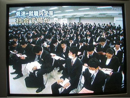 | ◇TV에 방영된 일본 회사의 면접 대기실. 모두 검은색 정장에 흰 와이셔츠와 블라우스를 입고 있다. 공산국가의 인민복 마냥 제복과 유니폼으로부터 벗어날 수 없는 게 일본인들의 숙명이다. |