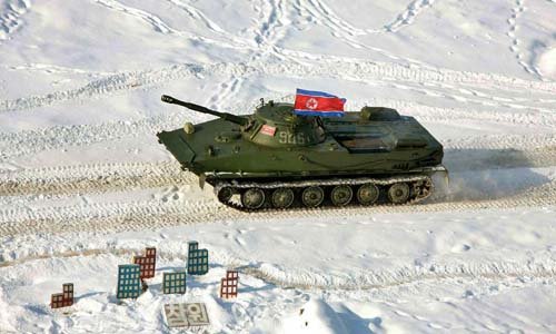 | ◇북한 조선중앙통신이 지난 5일 김정일 국방위원장의 ‘근위 서울류경수제105땅크(탱크)사단’ 시찰 소식을 전하면서 공개한 사진. 인공기를 단 북한 탱크가 남한 지명이 적힌 표지판 옆을 지나가는 모습이다. 평양조선중앙통신, 연합뉴스 |