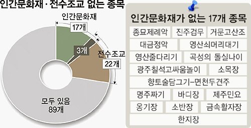 24일 세계일보가 문화재청의 ‘중요무형문화재 현황’을 분석한 결과 중요무형문화재로 지정됐으면서도 보유자가 없는 종목은 17개로 전체의 13.6%에 달했다. 이들 종목은 종묘제례악, 진주검무, 거문고산조, 대금정악, 영산쇠머리대기, 영산줄다리기, 곡성의 돌실나이, 광주칠석고싸움놀이, 소목장, 향토술담그기-면천두견주, 명주짜기, 바디장, 제주민요, 옹기장, 소반장, 금속활자장, 한지장이다. 이 가운데 제주민요와 옹기장은 인간문화재 조을선·이내원씨가 사망한 뒤 10년째 보유자 없이 명맥만 유지하고 있다.