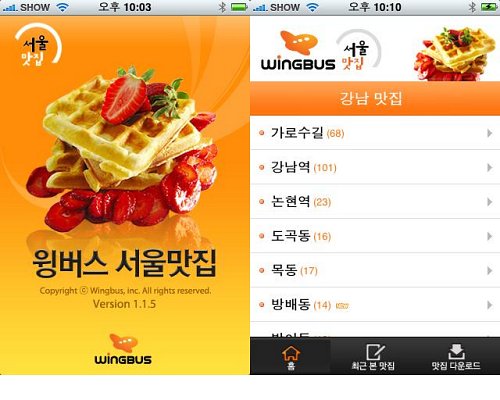 윙버스에서 제공하는 ‘서울맛집’은 점심 미팅 장소 섭외를 위한 최적의 애플리케이션이다. 이 애플리케이션은 서울시내에 위치한 각 동별로 상세 맛집에 대한 정보를 일목요연하게 제공한다. 처음 방문하는 지역에도 당황할 필요 없이 아이폰에 다운로드된 ‘서울맛집’ 정보를 검색하면 근처 맛집에 대한 평가와 함께 취향에 맞는 음식점을 고르기만 하면 된다. 뿐만 아니라 블로거의 맛집 사진도 감상할 수 있어 어떤 메뉴의 음식이 나오는지 추가적인 정보를 얻을 수 있다. 또한 예약을 원할 경우도 맛집 주소와 연락처에 대한 기본 정보를 제공하므로 걱정할 필요가 없다.
