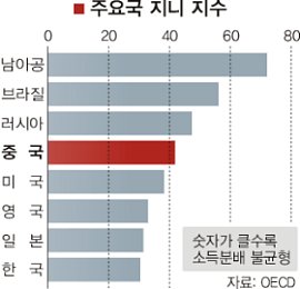 중국의 소득 격차는 미국, 한국보다는 크나 러시아, 브라질보다는 양호한 것으로 나타났다.