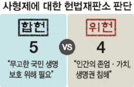 반면 김희옥 등 재판관 4명은 “사형제도가 생명권을 침해해 헌법에 어긋난다”는 취지로 위헌 의견을 냈다.