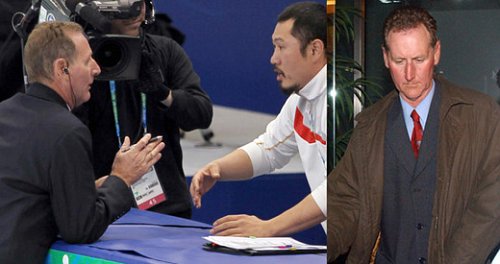 | 휴이시 심판이 25일 오전(한국시간) 밴쿠버 동계올림픽 여자 쇼트트랙 3000m 계주 결승에서 1위로 들어 온 한국대표팀의 실격 이유를 최광복 코치에게 전하고 있다. 휴이시 심판은 지난 솔트레이크 올림픽에서 김동성을 실격처리했던 심판이다.<연합뉴스 사진제공> |