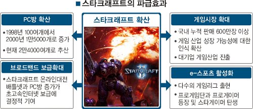 초고속인터넷 서비스 대량 보급·PC방 활성화와 맞물려 스타크래프트는 온 국민이 즐기는 게임이 됐고, 이때부터 게임은 당당한 문화상품이자 중요 IT산업으로 자리 잡게 됐다. 10여년 이상 PC방 최고 인기 게임 자리를 놓치지 않은 스타크래프트의 경제적 효과에 대해 지난해 한국게임산업진흥원은 “e스포츠 종목과 스타크래프트의 경제 유발 효과는 고용 창출 1조8500억원, PC 및 IT 산업효과 1조3700억원 등 4조700억원에 달한다”고 분석한 바 있다.