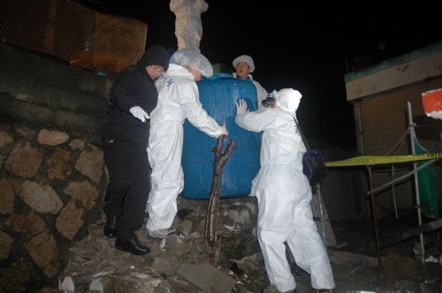 | ◇이유리 양 시신이 유기됐던 최모씨 집 보일러용 물탱크를 7일 새벽 부산경찰청 여중생 실종사건 수사본부 수사관들이 정밀감식을 하기 위해 옮기고 있다. <부산경찰청 실종사건 수사본부 제공> |