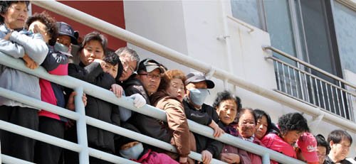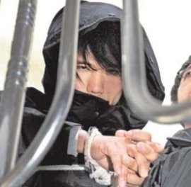 | ◇16일 실시된 부산 여중생 이모(13)양 납치살해 피의자 김길태의 범죄행위에 대한 현장검증이 실시되는 도중 주민들이 이동 중인 그의 모습을 지켜보고 있다. 부산=연합뉴스 |