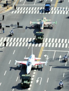 시속 8㎞ 도로 위 전투기 입력 : 2010-03-17 10:28:05 수정 : 2010-03-17 10:28:05 구글 네이버 유튜브 하늘을 날던 전투기가 도로를 활주로 삼아 달리고 있다. 공군 전투기 F-5가 16일 광주공항을 출발해 서구 상무지구 광주광엑스포 행사장으로 이동하고 있다. 공군 전투기는 1인승과 2인승 2대로, 경찰 호위로 전투제1비행단에서 광엑스포 행사장인 상무시민공원까지 총 4.5㎞ 구간을 시속 8㎞ 속도로 이송됐다. 광주=연합뉴스 Copyright ⓒ 세계일보. 무단 전재 및 재배포 금지 세계일보