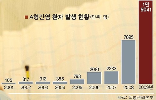 21일 질병관리본부에 따르면 우리나라의 A형간염 환자는 2001년 105명에서 2002년 317명, 2003년 312명, 2004년 355명, 2005년 798명, 2006년 2081명, 2007년 2233명, 2008년 7895명, 2009년 1만5041명으로 8년 만에 143배나 폭증했다.