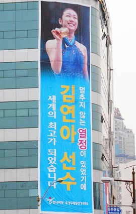 한나라당 대전 유성구 정당선거사무소가 피겨 월드스타 김연아 선수의 사진이 담긴 대형 현수막(사진)을 내걸어 논란이 되고 있다.