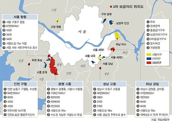 지구별 보금자리 공급량은 서울 항동과 인천 구월이 각각 3400가구와 4300가구, 하남 감일과 성남 고등은 각각 8400가구와 2700가구다. 광명·시흥은 가장 많은 6만9000가구가 공급되지만 이 중 3차 물량은 2만2000가구이며, 나머지는 향후 2∼3차례에 걸쳐 나눠 분양된다. 따라서 3차 전체 공급량은 1·2차와 비슷한 총 4만800가구가 될 전망이다.