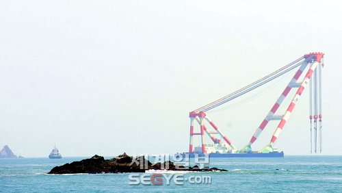 | ◇침몰한 해군 천안함을 인양하기 위해 지난달 29일 경남 거제를 출발한 2200t급 해상크레인 ‘삼아 2200호’가 2일 백령도 인근 소청도 해상에서 출항 대기하고 있다. 이종덕 기자 |