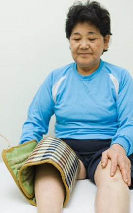 | ◇한 중년여성이 무릎을 온찜질하고 있다. 퇴행성 관절염 환자들이 통증을 덜기 위해서는 무릎을 따뜻하게 유지하는 것이 중요하다. |