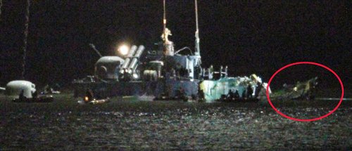 | 절단면 야간조사 12일 오후 천안한 침몰 해역에서 들어올려져 4.5㎞가량 떨어진 함수 침몰 해역으로 옮겨진 함미 부분의 절단면(붉은 원) 주위에서 해군 해난구조대 대원 등이 불을 밝힌 채 절단면을 살펴보고 있다. 백령도=연합뉴스 |