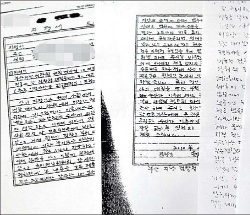 | ◇검찰에 접대와 향응을 제공했다고 주장하는 정모(52)씨의 진정서. 정씨는 진정서에 접대와 향응을 제공했다는 전·현직 검찰 간부들의 실명을 적어 파문이 일고 있다. 부산=연합뉴스 |