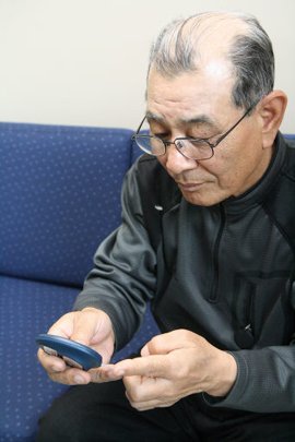 | ◇한 중년 남성이 혈당계를 이용해 혈당을 측정하고 있다. 어버이날을 앞두고 스스로 혈압이나 혈당을 체크해 건강을 관리하는 자가측정기들이 ‘효 선물’로 인기를 모으고 있다. 그러나 이들 건강 체크 기구는 반드시 보조적인 장비로만 사용해야 하며, 구체적인 질환의 증상이 있을 경우에는 전문의와 상담해야 한다. |