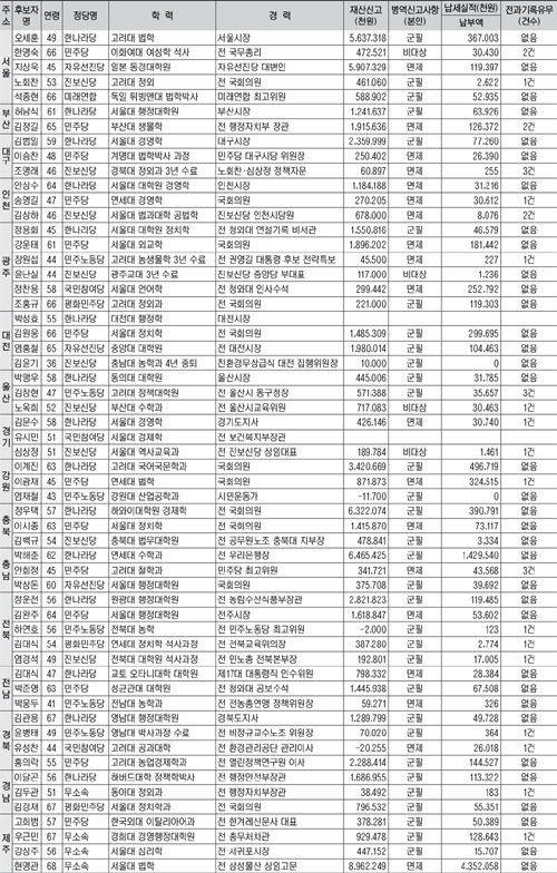 ▶정당은 한나라당(한)·민주당(민)·자유선진당(선)·민주노동당(노)·국민중심연합(중)·미래연합(미)·국민참여당(참)·친박연합(친)·진보신당(진)·평화민주당(평)·창조한국당(창)·자유평화당(자)·국제녹색당(녹)·무소속(무)