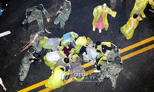 | 5.18 광주민주화운동 30주년 기념 전야제가 17일 저녁 광주 동구 금남로 옛 전남도청 앞 광장에서 열려 80년 5월 당시 공수부대의 진압장면이 재현되고 있다.<연합> |