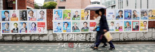 | ◇ 6·2 지방선거를 열흘 앞둔 23일 서울 종로구 효자동에 30여장이 넘는 후보자 선거벽보가 부착된 담벼락 앞을 우산 쓴 시민이 지나치고 있다. 남제현 기자 |