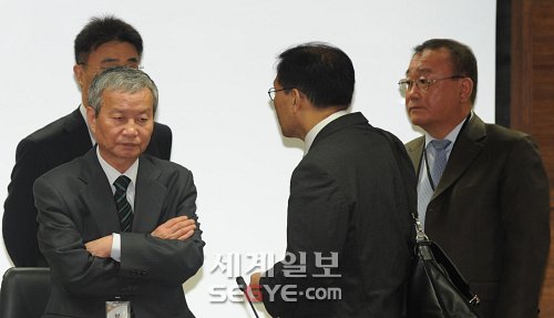 | ◇천안함 침몰 사건과 관련해 정부의 강력한 대북 조치로 남북교역과 경협이 거의 중단된 가운데, 25일 오전 서울 세종로 정부중앙청사에서 엄종식 통일부 차관 주재로 열린 교역, 경협기업대표 간담회에 참석한 업체 대표들이 회의 시작 전 곤혹스러운 표정을 지으며 얘기를 나누고 있다. 남제현 기자 |