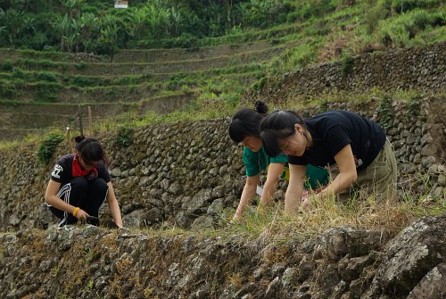 | 계단식 논 복원작업에 참가한 공정여행 참가자들의 모습 |