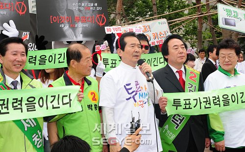 | ◇민주당 정세균 대표(가운데)가 28일 서울 신촌 홍익대 앞에서 대학생들에게 6·2지방선거 투표 참여를 호소하고 있다. 이범석 기자 |