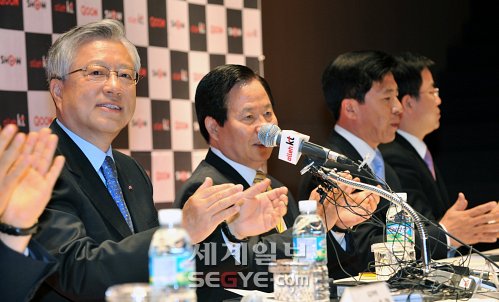 | ◇31일 서울 광화문 KT본사에서 열린 ‘KT-KTF 합병 1주년’ 기자간담회에서 이석채 KT회장(맨 왼쪽)이 그간의 성과와 향후계획 등을 설명한 뒤 격려의 박수를 하고 있다. 남제현 기자 |
