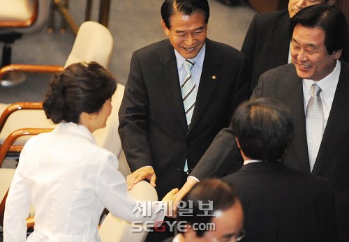 | 손은 잡았지만… 한나라당 박근혜 전 대표(왼쪽)가 8일 18대 국회 후반기 원구성을 위해 열린 국회 본회의에 참석해 김무성 원내대표(오른쪽)와 악수하고 있다. 이범석 기자 |