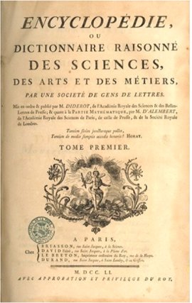 백과전서는 18세기 프랑스 계몽사상가 디드로와 달랑베르가 1772년 35권으로 편찬한 서양 근대 최초의 백과사전이다. 노동자 1000여명이 사전 제작에 참여해 25년간 이 일로 생계를 이었으며, 원본 4300질과 해적본 4만여질까지 더하면 18세기 당시 성경 다음으로 많이 팔린 책이다.