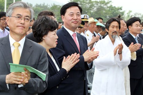 | ◇김두관 경남도지사(가운데)가 1일 경남 창원시 사림동 경남도청 앞 광장에서 열린 ‘제34대 경남도지사 취임식’에서 문재인 전 청와대 비서실장(맨 왼쪽), 강기갑 민주노동당 대표(한복차림) 등 참석 인사들과 함께 박수를 치고 있다. 창원=연합뉴스 |