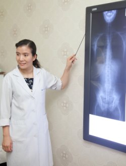 | 하미경 원장이 엑스레이필름을 보고 척추 진단을 하고 있다. |