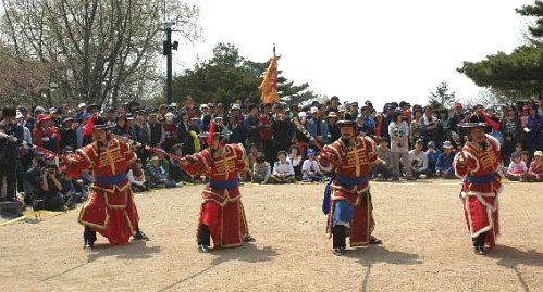 | ◇남한산성 수어장대에서 수어청 병사들의 십팔기 시연을 벌이고 있는 십팔기 보존회 회원들. |
