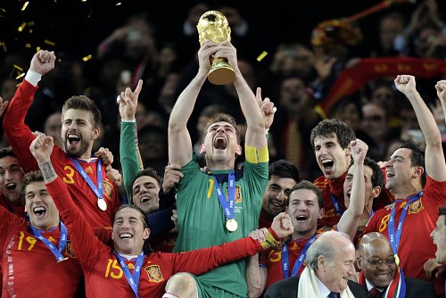 | "첫 우승이다"..환호하는 스페인 선수들 스페인 축구대표팀 골키퍼 이케르 카시야스가 남아프리카공화국 요하네스버그 사커시티 경기장에서 열린 네덜란드-스페인 간 월드컵 결승전에서 1-0으로 이긴 후 우승 트로피를 높이 들고 환호하고 있다. <연합> |