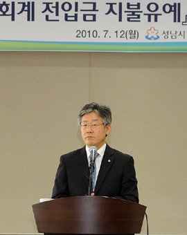 | ◇이재명 경기도 성남시장이 12일 성남시청 대회의실에서 기자회견을 열어 “판교신도시 조성을 위한 판교특별회계에서 빌려 쓴 돈 5200억원을 단기간에 갚을 수 없다”며 지급유예 선언을 하고 있다. 연합뉴스 |