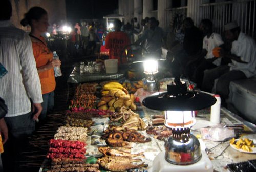 한참 동안 음악을 듣고 나서 요새를 나오니 꼬치구이를 파는 포장마차가 줄지어 있는 광경이 눈앞에 펼쳐진다. 이 포장마차 장터는 투어가이드북에 소개될 정도로 잔지바르의 명물 가운데 하나다. 원래는 포로다니 공원에서 매일 밤 열리는 장터인데, 필자가 찾아갔을 때에는 공원이 공사 중이라 요새 옆으로 장소를 옮긴 것이다. 제법 기다란 골목 양쪽 길가에는 오징어·새우·문어 등 수산물 꼬치구이를 파는 포장마차가 즐비하다. 포장마차의 흐릿한 불빛과 꼬치구이의 연기가 더해져 길거리 포장마차 특유의 분위기를 자아낸다.