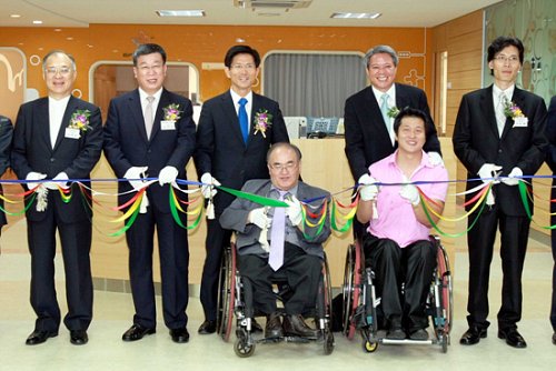 | ▲ 뒷줄 왼쪽부터 강지원 푸르메재단 대표, 윤여철 현대차그룹 부회장, 김문수 경기도지사, 최대호 안양시장, 오도영 (주)이지무브 대표. 앞줄 왼쪽부터 오길승 사단법인 행복한동행 대표 |