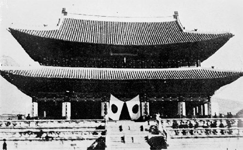 | ◇경술국치일인 1910년 8월29일 경복궁 근정전에 걸린 일장기. 오늘 우리는 꼭 100년 전 그때의 치욕과 순국자들의 고귀한 정신을 까마득히 잊고 있다. 독립기념관 제공 |