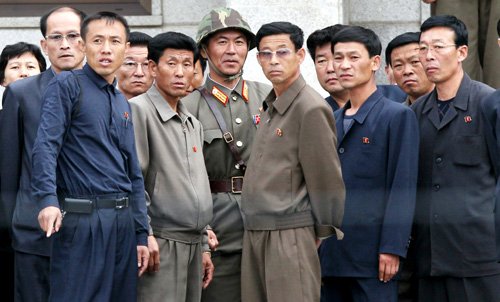 | ◇南 바라보는 北 주민들 44년 만에 열린 북한 조선노동당 대표자회에서 김정은 후계구도가 공식화된 가운데 29일 경기 파주 비무장지대 내 판문점에서 노동당원으로 보이는 북한 주민들이 북한군 병사와 함께 남측 구역을 바라보고 있다. 판문점=연합뉴스 |