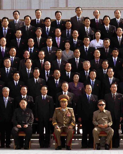 | 정은 첫 공개 (평양 조선중앙통신=연합뉴스) 북한 김정일 국방위원장이 평양 금수산기념궁전에서 당 중앙기관 성원 및 제3차 노동당 대표자회 참가자와 기념촬영을 하고 있다.김정일 왼편 두번째가 김정은 중앙군사위원회 부위원장이다. 정확한 촬영일시는 밝히지 않았다. |