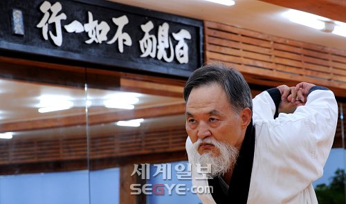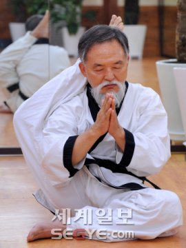 | ◇우혈 허장수 선생이 ‘혈기도’ 행공에 앞서 몸을 풀고 있다. 17년간 산중에서 수련하며 356가지 행공을 익혔다는 우혈 선생은 일흔이 넘은 나이에도 고관절이 360도 자유자재로 회전한다. 허정호 기자 |