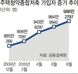 지난 8월에만 가입자가 20만명 가까이 늘어 980만명을 가뿐히 넘어서는 등 증가 추세를 감안할 때 1000만명 돌파는 시간 문제로 보인다. 특히 만능통장의 인기 덕에 최근 감소세를 보였던 청약통장 전체 가입자 수는 한달 만에 다시 증가로 반전했다.