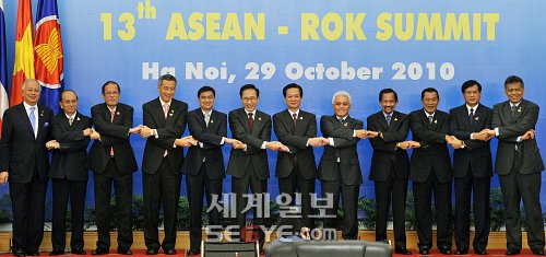 | ◇손잡은 韓·아세안 정상들 이명박 대통령이 29일 베트남 하노이 국립컨벤션센터에서 열린 제13차 한·아세안 정상회의에 참석해 아세안 10개국 정상들과 손을 맞잡고 기념촬영을 하고 있다. 왼쪽부터 나집 툰 라작 말레이시아 총리, 떼인 세인 미얀마 총리, 베니그노 노이노이 아키노 필리핀 대통령, 리셴룽 싱가포르 총리, 아피싯 웨차치와 태국 총리, 이명박 대통령, 응우옌떤중 베트남 총리, 하타 인도네시아 경제조정장관, 하사날 볼키아 브루나이 국왕, 훈센 캄보디아 총리, 부아손 부파반 라오스 총리, 수린 핏수완 아세안 사무총장. 하노이=남제현 기자 |