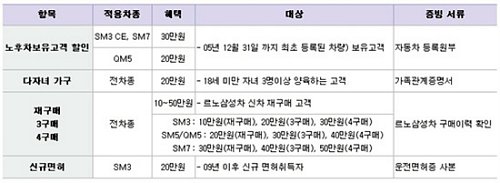 18세 미만의 자녀를 3명 이상 양육하는 “다자녀 가구”에게는 전차종 20만원의 할인이 제공되며, 2009년 신규 면허 취득자에게는 SM3 구매시 20만원을 할인해 준다.