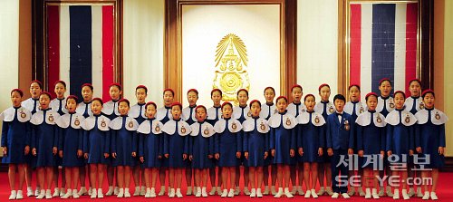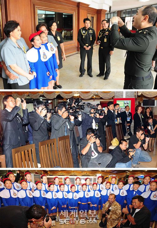 | (사진 위)리틀엔젤스 예술단 단원들이 태국 국방부 관계자들과 기념촬영을 하고 있다. (사진 중간)9일 태국 국회의사당에서 많은 태국 취재진들이 리틀엔젤스를 취재하고 있다. (사진 아래)9일 태국 국회의사당에서 태국 취재진들이 취재 도중 리틀엔젤스와 기념촬영을 하고 있다. 방콕=송원영기자 |