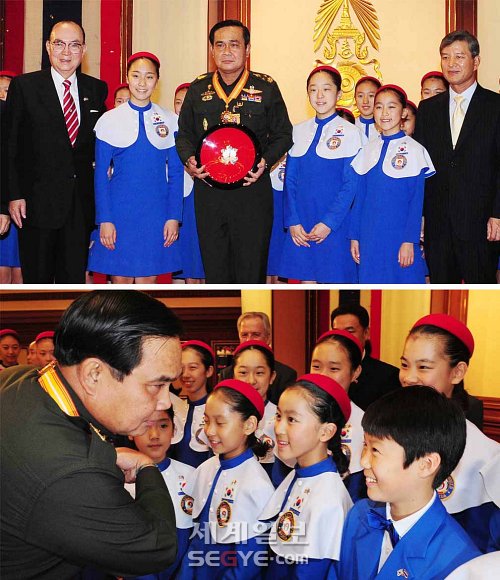 | (사진 위)9일 태국 방콕 국방부에서 리틀엔젤스와 프라윳 찬오차 총사령관이 기념촬영을 하고 있다. 왼쪽 첫번째 유엔군한국전참전 60주년 기념사업회 박보희 추진위원장, 왼쪽 세번째 프라윳 찬오차 총사령관, 오른쪽 첫번째 정해문 태국주재 한국대사 방콕=송원영기자 (사진 아래)9일 태국 방콕 국방부에서 리틀엔젤스 단원들이 프라윳 찬오차 국방부 총사령관과 마주 보며 밝게 웃고 있다. 방콕=송원영기자 |