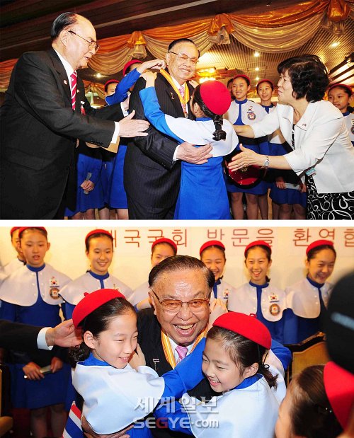 | (사진 위)리틀엔젤스 예술단 단원들과 유엔군한국전참전 60주년 기념사업회 박보희 추진위원장이 9일 태국 방콕 국회의사당을 방문해 차이 치드촙 태국하원의장에게 기념 메달을 목에 걸어주고 있다. 방콕=송원영기자 (사진 아래)9일 태국 방콕 국회의사당을 방문한 리틀엔젤스 예술단 단원들을 치드촙 태국하원의장이 포옹하며 환영하고 하고 있다. 방콕=송원영기자 |