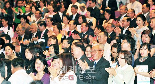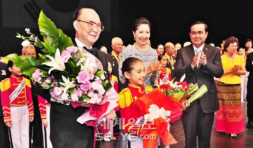 | ◇태국 방콕 국립문화극장 무대에서 프라윳 찬오차 태국 국방부 총사령관 내외가 멋진 보은 공연을 펼친 리틀엔젤스 단원들과 한국전참전60주년 기념사업회 박보희 추진위원장에게 박수를 치고 있다. |