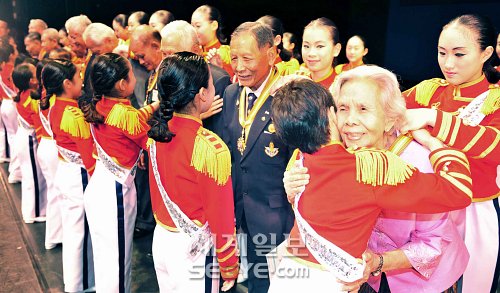 | ◇리틀엔젤스 예술단이 11일 태국 방콕 국립문화극장에서 한국전 참전용사들에게 영웅 메달을 걸어주고 있다. 이날 공연은 한국전쟁 60주년을 맞아 유엔 참전국과 참전용사들의 희생에 보답 하기위해 열렸다. 한국전쟁에 적십자 간호사로 참전한 닛 탑자이(86,오른쪽 두번째) 씨는 "리틀엔젤스가 한국전쟁에 참가한 태국 군인들을 잊지 않고 태국을 방문해 아름답고 멋진 공연을 보여줘서 고맙다"고 말했다. |
