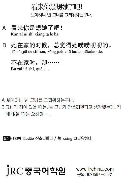 [맛있는 중국어] 보아하니 넌 그녀를 그리워하는구나.