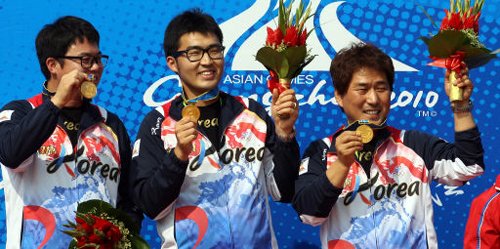 | ◇사격에서 또다시 금맥이 터졌다. 이 종목에서만 벌써 10번째 금메달이다. 17일 열린 2010 광저우 아시안게임 남자 25m 스탠더드 권총 단체에서 금메달을 딴 장대규, 홍성환, 황윤삼(왼쪽부터)이 메달을 들어보이며 환하게 웃고 있다. 광저우=연합뉴스 |